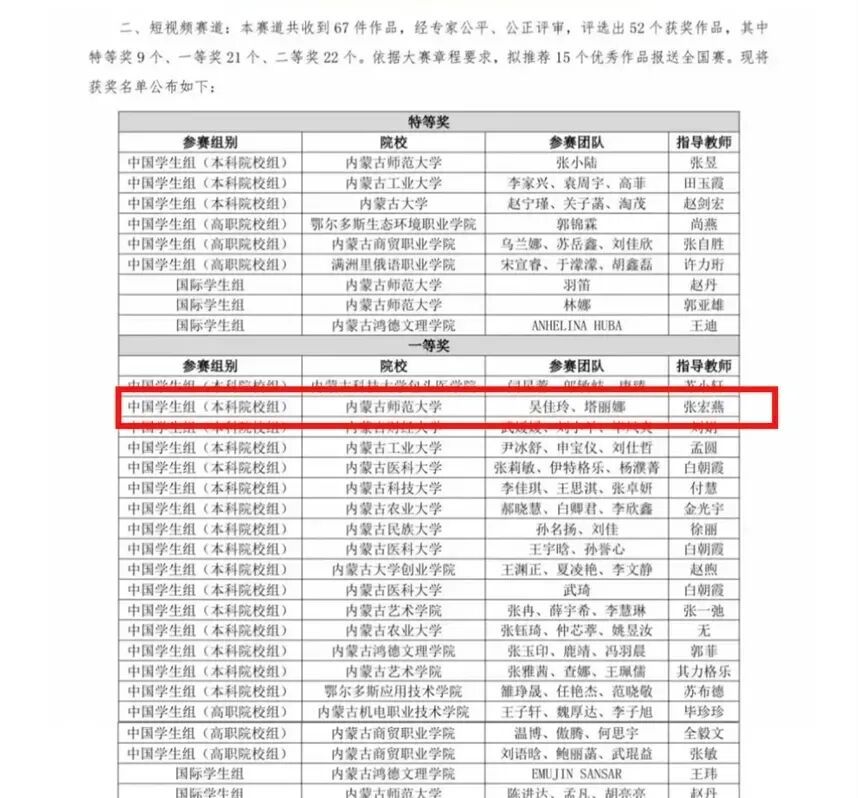 近日,第八届“外研社杯”全国高校学生跨文化能力短视频大赛赛果公布,内蒙古师范大学学生制作的短视频作品均斩获佳绩。其中,内师大外国语学院学生吴佳玲和塔丽娜同学的作品《中华文化的千年絮语:从指尖到世界》斩获大赛内蒙古赛区一等奖,全国赛二等奖。