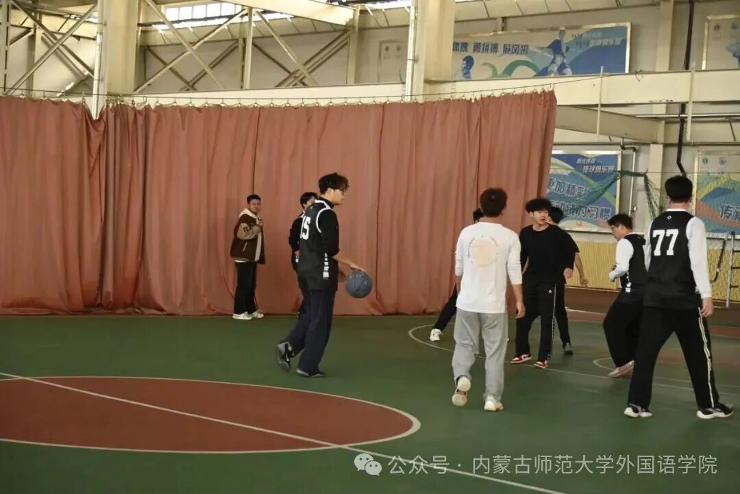 11月23日上午9时,外国语学院“逐梦篮途”篮球赛在内蒙古师范大学盛乐校区竞秀馆正式拉开帷幕。本次比赛有两支队伍共11人参赛,以“友谊第一、比赛第二”为宗旨,展现外院学子昂扬向上的精神风貌。 同学们凭借默契配合完成整场对决。两支队伍在攻防之间灵活转换,节间休息时自发讨论战术,同时也展现了良好的团队协作与体育精神。